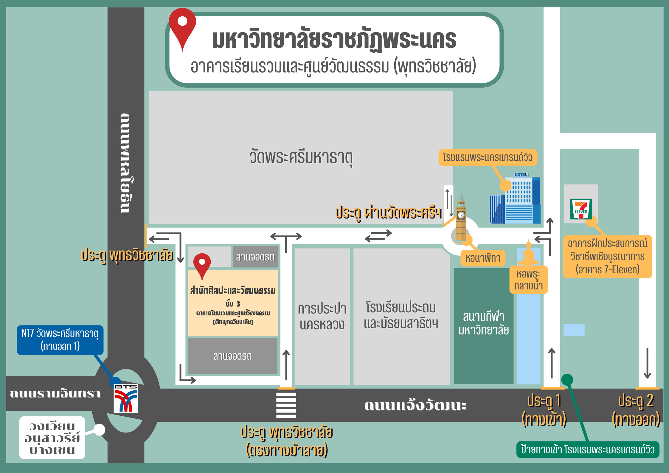 สำนักศิลปะและวัฒนธรรม มหาวิทยาลัยราชภัฏพระนคร เลขที่ ๙ ถนน แจ้งวัฒนะ แขวง อนุสาวรีย์ เขต บางเขน จังหวัด กรุงเทพฯ ๑๐๒๒๐